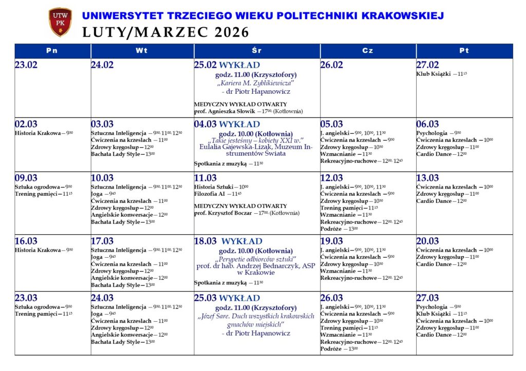 UTW-kalendarz zajęć STYCZEŃ 2026 r.